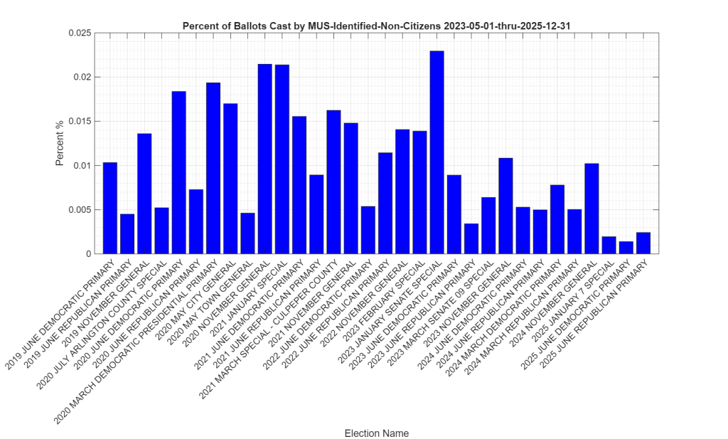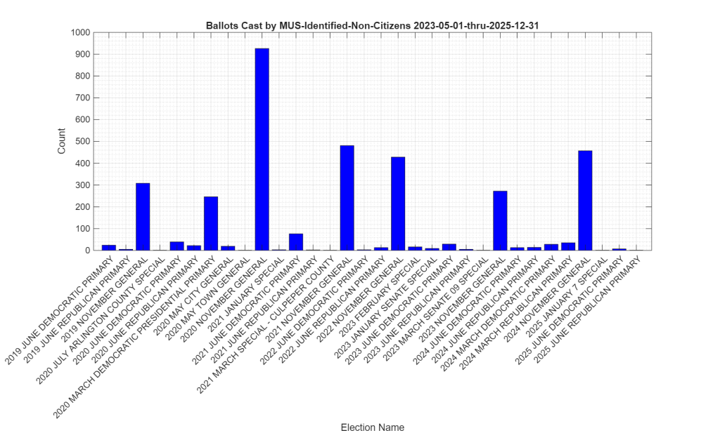 The fact that a small number of these identified non-citizen registrations are also associated with (presumably … if the data from ELECT is accurate) illegally cast ballots in previous elections does raise a number of questions that citizens should be (politely) asking and discussing with their legislators, elected and appointed government officials. Each act of non-citizen voting is a de-facto disenfranchisement of legal voters rights, and is a punishable offense under VA law.